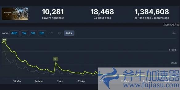 回想一下这游戏发行的过程,2月28号刚发售那天,《怪物猎人:荒野》一下子就有138万人同时在线玩,把卡普空PC平台游戏刚发售时的记录都打破了。可这好势头转眼就没了,因为游戏在性能优化方面毛病太多,在PC平台上被玩家们一顿批。SteamDB最新统计出来的数据表明,到6月21号的时候,这游戏24小时内玩的人数最多也就18468人,跟以前人数最多的时候比,差太远了。