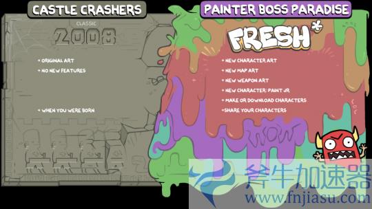作为《城堡毁灭者》发售13年以来头一个得花钱买的DLC,“画家Boss乐园”带来了好多让人惊喜的新东西。这里面最吸引人注意的,就是玩家盼了好久的能自己设定角色的功能。除此之外呢,这个DLC还包括新设计出来的官方角色、武器,还有地图的美术方面的东西。