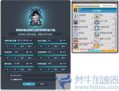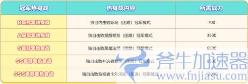 冠军热身赛:是NPC“皇室骑士汉斯洛特”主办的,一开始给2个冠军位置。随着冠军级别升高,会慢慢解锁更多位置,最多能登记3个冠军。取消已经登记的冠军得花10亿金币。