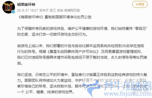 《暗黑破坏神2:重制版》国服这几天正式启动不删档公测啦,给大伙带来超刺激的游戏感受!开服头一天,官方赶紧发了个重要通知,说要把36个违规的账号给封了,就是为了把游戏环境弄干净。