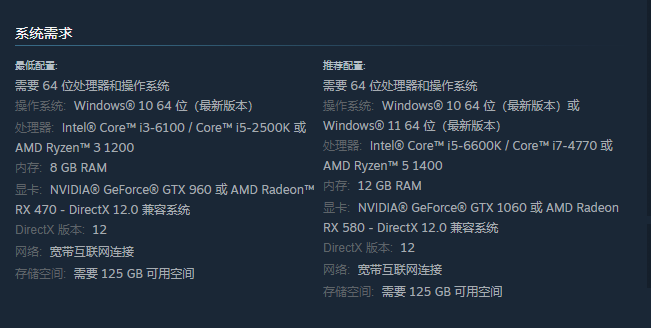 显卡:NVIDIA GeForce GTX1060或AMD镭龙RX 580-DirectX 12.0兼容系统,DirectX版本:12,网络:宽带互联网连接,存储空间:需要125GB可用空间。