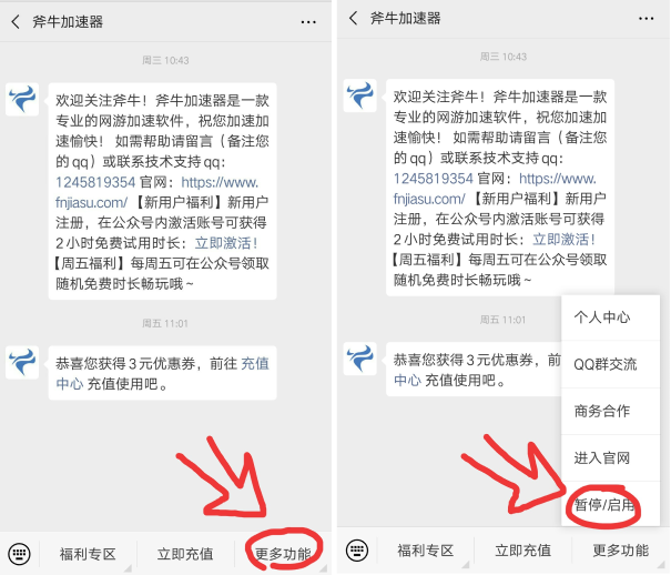 位置一:进入【斧牛加速器公众号】之后,在右下角点击【关于斧牛】,就可以看到所显示的功能栏中最后一个就是【暂停/开启】,用户可以在这个位置进行开启或者暂停。