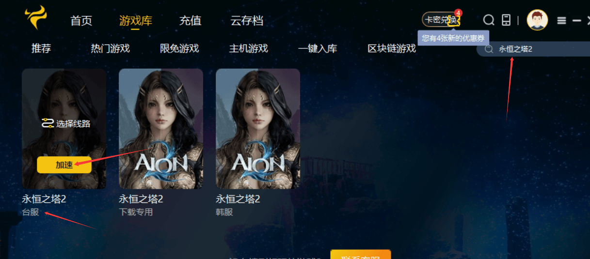 首先,玩家打开斧牛加速工具,首页搜索“永恒之塔2”,找到自己所在区服,一键点击加速。