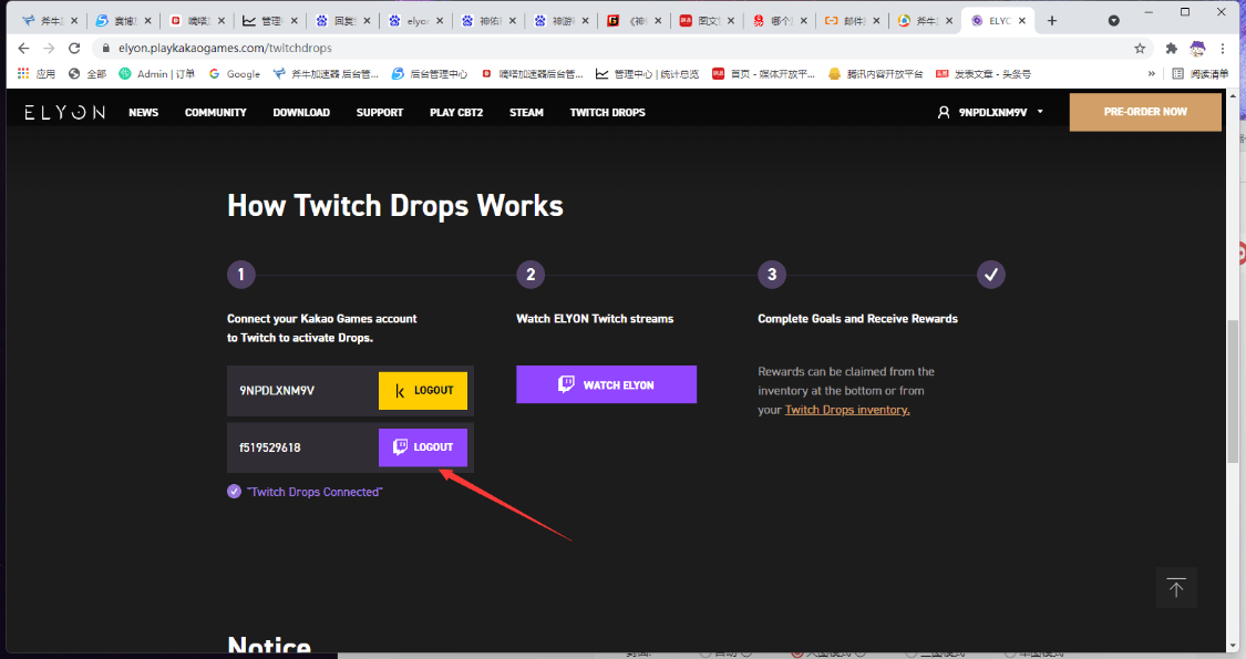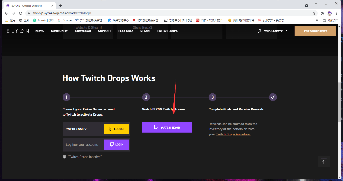 6.观看满一个小时后,在ELYON 官网活动页面,点击 查看物品栏,会自动跳转到 twitch直播 ,就可以看到CBT2测的资格奖励 ,点击领取